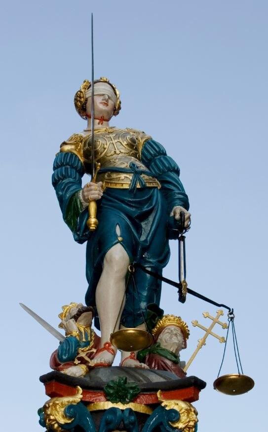 已知的第一個失明正義女神的表現是Hans Gieng於1543年創作的《正義噴泉》(Fountain of Justice)雕像,位於瑞士伯恩。