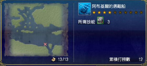 | 物品 | ※配方︰歐洲辭典製法 ※裝備︰◎石榴石胸針、◎石榴石戒指、◎星彩紅寶石髮飾、◎星彩紅寶石耳環、◎縞瑪瑙胸針 ※消耗品︰◎魔法印信、◎地靈印信、◎水妖印信、◎火蜥印信、純鐵板金、沉船的殘片地圖 ※交易品︰蜂蠟、珍珠、青銅像 ※船部品︰主桅上高帆 |