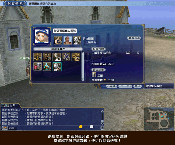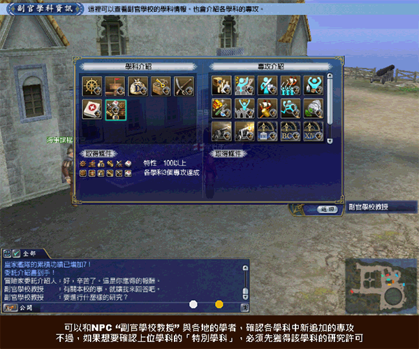 | 在副官學校的各學科追加了新的可研究專攻領域。 選擇想研究的學科、副官和専攻後,便能開始新的研究。 執行研究行動並完成研究,就找NPC “副官學校教授” 或各地的學者報告吧。 ※要進行副官研究必須要先入學副官學校。 ※根據同行副官的特性,也有無法進行副官研究的可能。 |